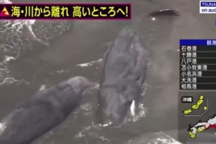 Setidaknya ada 4 paus yang terdampar di Kota Tateyama, Chiba, Jepang dan terekam dalam siaran langsung TV Jepang.